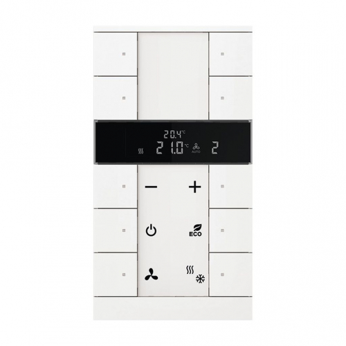 Frei konfigurierbares Multifunktionsbedienelement. Mit integriertem KNX-Busankoppler. Mit Beschriftungsfeld. Unterstützung der KNX-Funktionen durch innovatives Farbkonzept (gelb=Beleuchtung, blau=Jalousie, orange=RTR, magenta=Szene und weiß=neutral/keine Funktionszuordnung) oder Standardbeleuchtung rot/grün. Tasterfunktion: Schalten / Dimmen / Jalousie /Wert senden / Lichtszenen u.a. Master-/Slavebetrieb. Mit Grundlastbetrieb. Der Regler ist ein stetiger Raumtemperaturregler für Ventilator-Konvektoren (Fan Coil) in 2- und 4-Rohr Anlagen und konventionellen Heiz- oder Kühlanlagen Die Lüfterstufe kann manuell oder in den Automatikbetrieb geschaltet werden Klasse des Temperaturreglers: 1 Beitrag zur Raumheizungsenergieeffizienz: 1,0%. Anzahl Busteilnehmer: 1 Bei Bedarf entnehmen Sie bitte die programmierbaren Funktionen aus der aktuellen Applikationsbeschreibung die Sie von unserer Internetseite www.busch-jaeger.de herunterladen können.