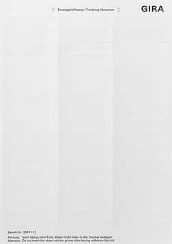 Beschriftungsbögen für Flächenschalter Reinweiß glänzend 15,8 x 67 mm 48 Schriftfelder - Vorgestanzte Beschriftungsbögen aus einer PET-Folie im DIN A4-Format. Beschriftungsbögen können nur mit einem Laserdrucker bedruckt werden. Um Ihren Druck zu gestalten, geben Sie auf der folgenden Website die Gira Artikelnummer Ihrer Textetiketten ein. https://www.avery-zweckform.com/software/avery-design-print